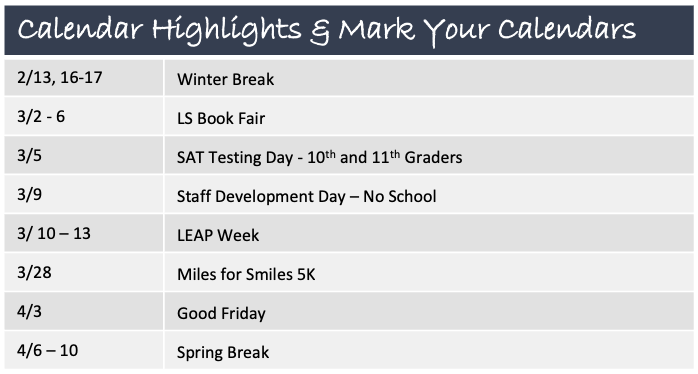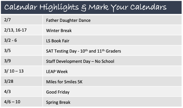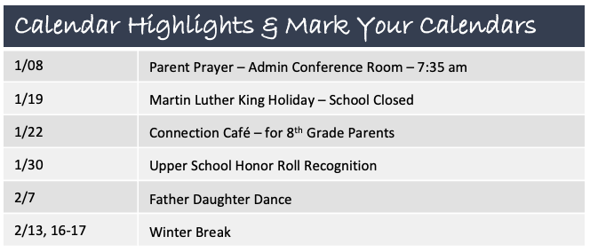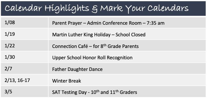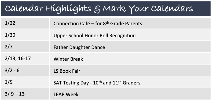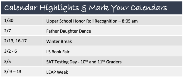 On Friday, January 24, the Upper School Honor Roll recipients will be recognized during a special program at 8:05 a.m. in the gym. Parents are invited to attend, and coffee will be provided. A list of recipients will be published next week. Invitations will not be emailed, so please be sure to check the list. Contact Tollie Ediger (tediger@wcalions.org) with any questions.