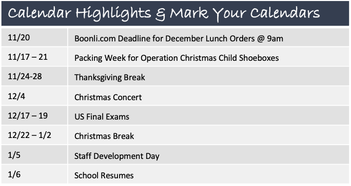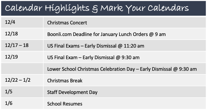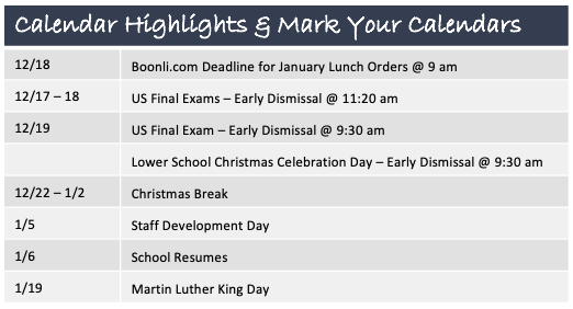 The end of our Fall Semester is just a couple of weeks away and that means it will be time for Upper School final exams! Below is information about final exam days.