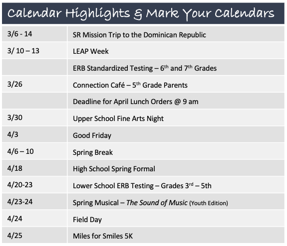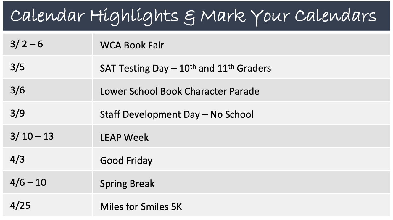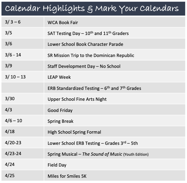 I encourage each parent to take time to read the State of the School publication which includes important updates about WCA and information and instructions regarding the re-enrollment process. You may also find the academic calendar overview for the 2025-2026 school year.