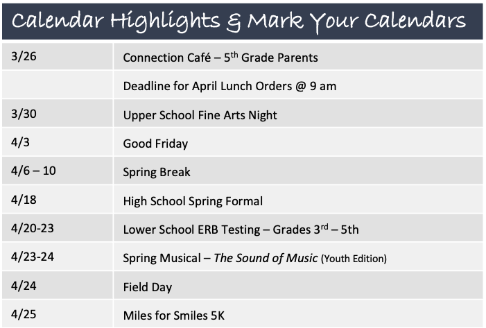 Join us for a special evening on Monday, March 30th, as we recognize the gifts and talents of our Upper School Fine Arts Students! Come hear fun musical numbers on ukuleles and guitars, classical music on the piano, songs performed by our Literary competition team, impressive visual art, choral works, and worship led by our Chapel Band. There is something for everyone to enjoy! Come support our students as they share the gifts that they have been developing all year long!