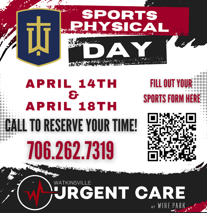 We are excited to announce that Watkinsville Urgent Care will be offering multiple dates for WCA parents to schedule a sports physical for your student athletes. It's important for parents to call ahead of time to schedule these appointments. There will be a $10 discount for WCA families so it will be important to indicate this when scheduling the appointment and arriving on site. To speed up the process, WCA families are strongly encouraged to follow this link to fill out the pre-participation questionnaire ahead of time.